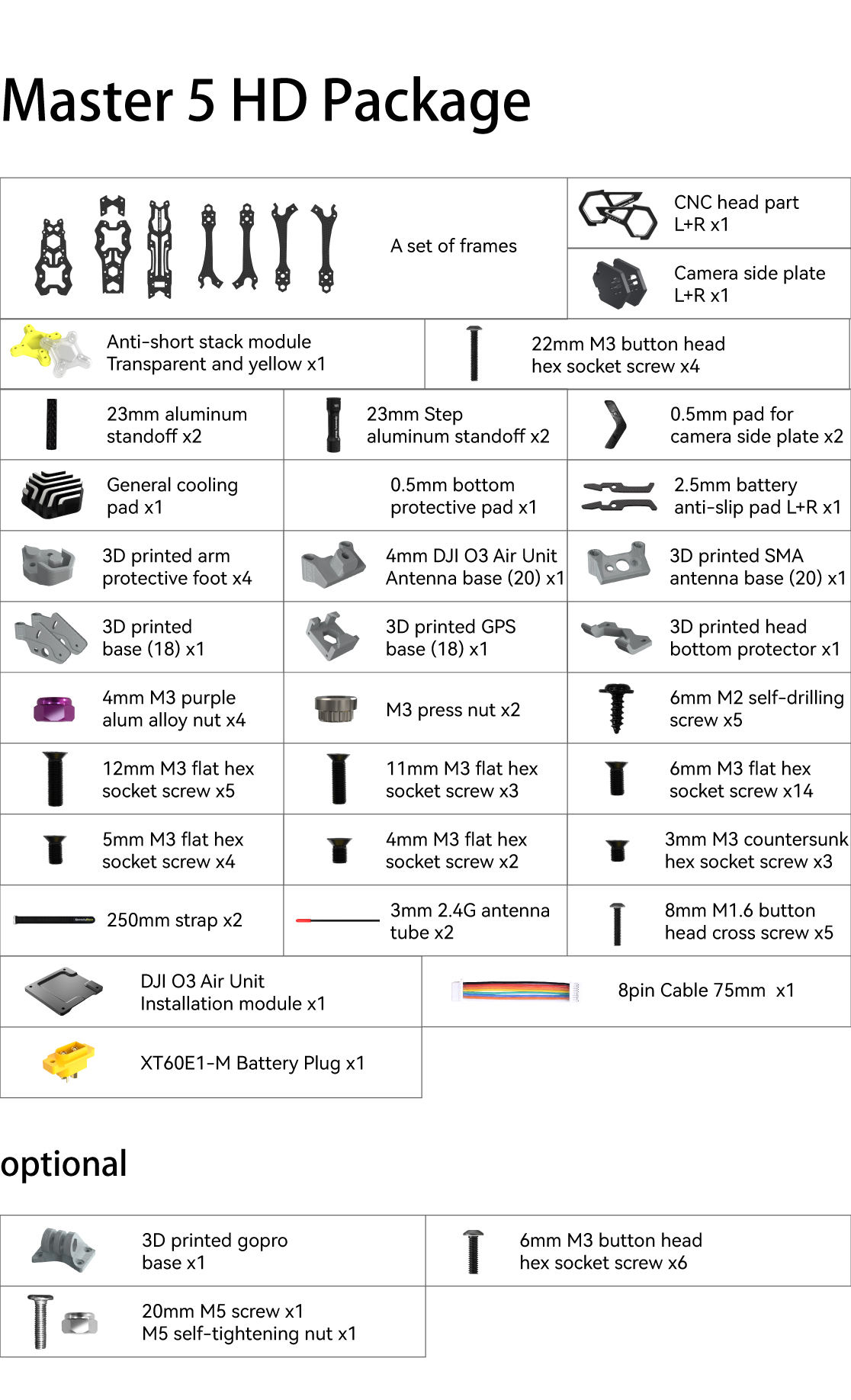 Master 5 series is designed for freestyle. Innovative anti-shock fixed stack structure mitigates effect from of motor for Gyro of FC, further stabilizing the running environment. And the arms quick release structure brings convenience for installation, with number of screws averaging 1.5 per arm. Honeycomb-shaped aluminum alloy CNC drone head ensuring better strength and look. Designed with H-FOV 130 section, it provides a larger field of view. Furthermore, detachable camera fixing plate is open for modifying, supporting more mounting holes for camera and helping get rid of vignetting. Honeycomb-shaped aluminum alloy cooling module (optional) is also designed for mounting under the VTX, improving the operation stability of DJI FPV and high-power analog VTX.